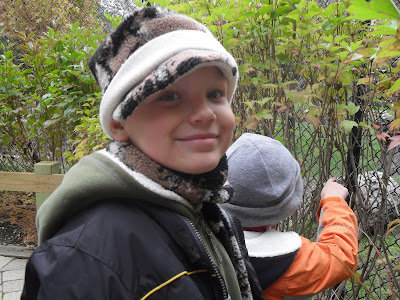 Then Monday Patty, Shala and I took the kids to the free zoo in Wheaton. Oh good lord. I don't know why we thought going to the zoo when it was 45*F was a good plan, but we managed. We even had a picnic! The best part? It was small. It took about 2 hours for eating, wandering, making a craft and playing on the big stack of straw bales. The kids were worn out and cold enough to not complain when we said we were leaving! YAY!