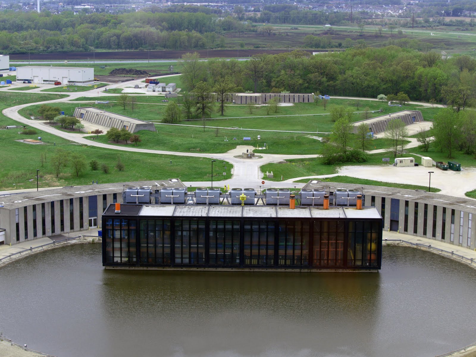 In the center of the photo you see a berm with what looks like a steel track on top? The accelerator is under there. It is four miles around. For comparison the Hadron Collider is 17 miles around.